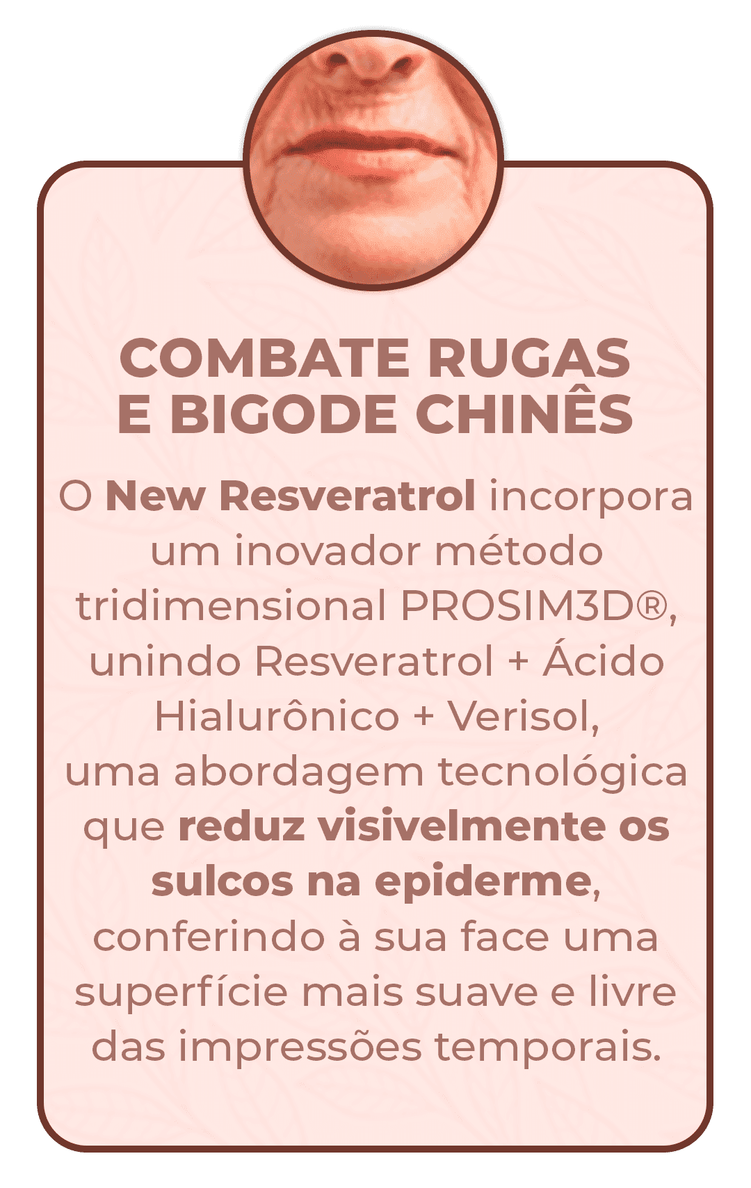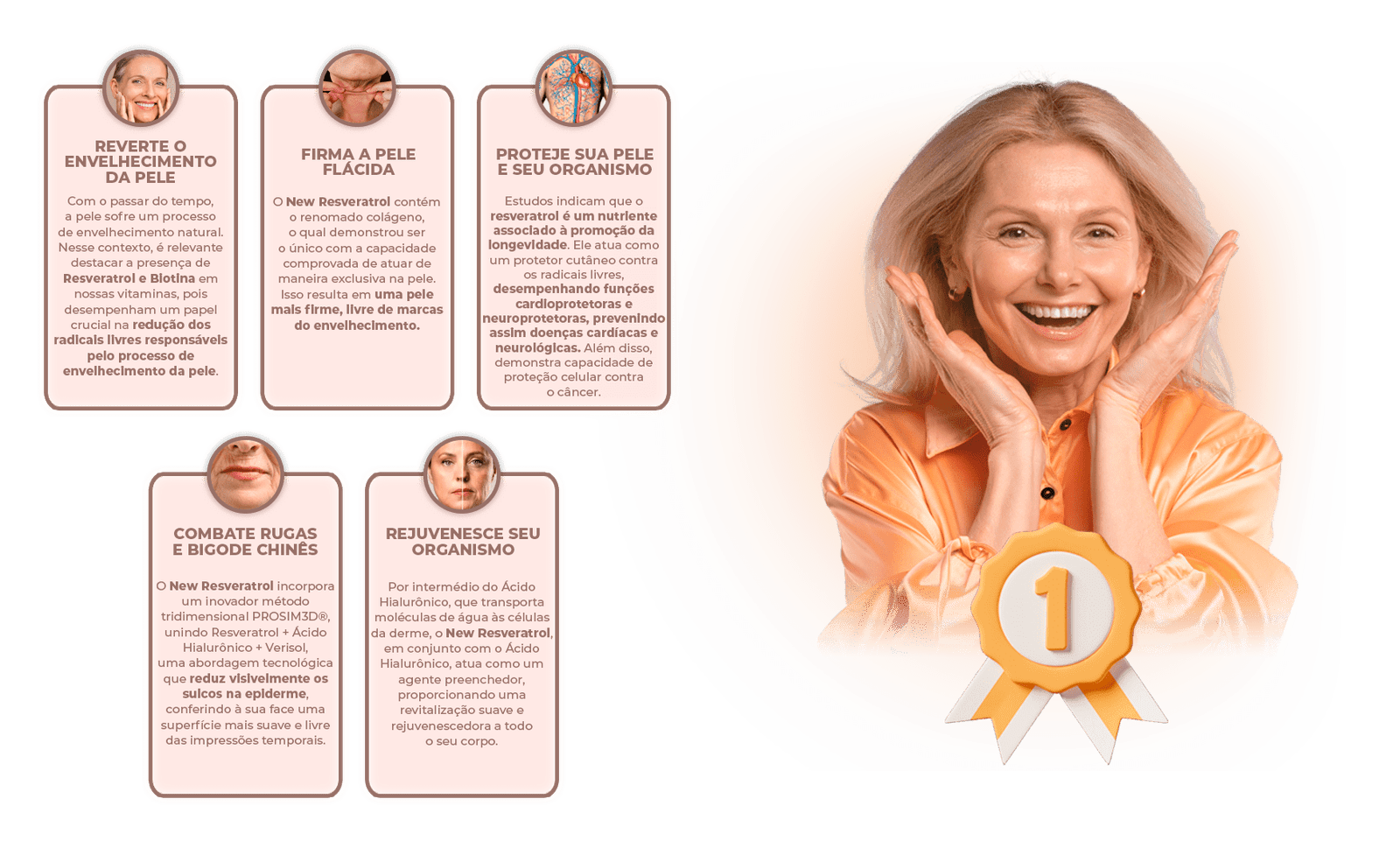 o New Resveratrol age diretamente na célula da cútis, proporcionando um tratamento de dentro para fora, sendo 100% absorvido pelo organismo graças ao VERISOL presente em sua composição, atuando diretamente na produção de colágeno, proporcionando uma pele firme e livre das rugas.
